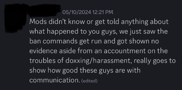 This occurred after a user within their server reported them for making jokes about doxxing a currently active moderator on the official discord.