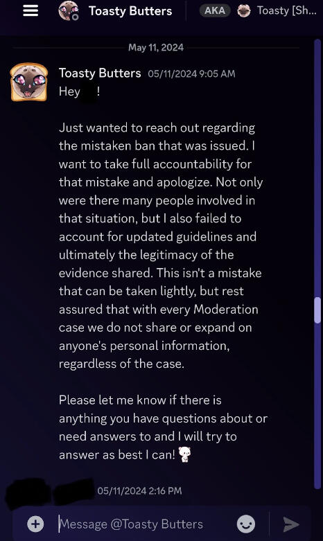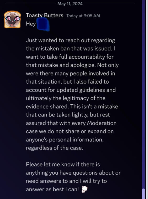 one last question.. were all 3 of us game banned?END————————————————————For confirmation, two were banned from the official server and the game. One has yet to be banned as of writing this (May 9th, 10pm EST).As of writing this (May 10th, 8:20pm EST), some of the volunteers and users were unbanned from both the game and the server after contacting Tokaliz about the situation.