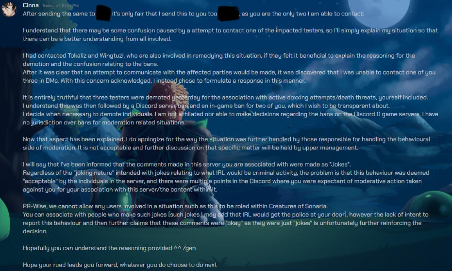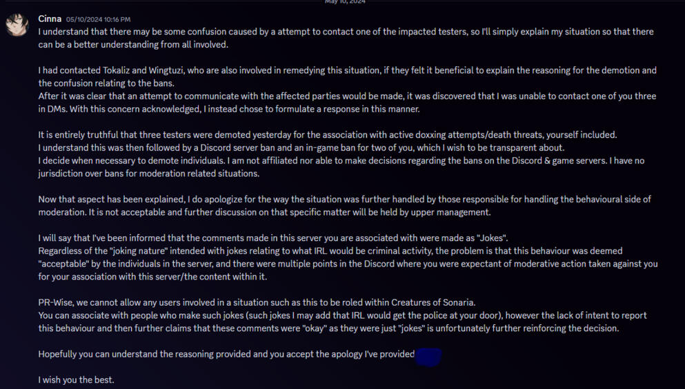 After sending the same to Anonymous3, it's only fair that I send this to you too Anonymous2, as you are the only two I am able to contact:I understand that there may be some confusion caused by a attempt to contact one of the impacted testers, so I'll simply explain my situation so that there can be a better understanding from all involved.I had contacted Tokaliz and Wingtuzi, who are also involved in remedying this situation, if they felt it beneficial to explain the reasoning for the demotion and the confusion relating to the bans.After it was clear that an attempt to communicate with the affected parties would be made, it was discovered that I was unable to contact one of you three in DMs. With this concern acknowledged, I instead chose to formulate a response in this manner.It is entirely truthful that three testers were demoted yesterday for the association with active doxxing attempts/death threats, yourself included. I understand this was then followed by a Discord server bars and an in-game ban for two of you, which I wish to be transparent about. I decide when necessary to demote individuals. I am not affiliated nor able to make decisions regarding the bans on the Discord & game servers. I have no jurisdiction over bans for moderation related situations.Now that aspect has been explained, I do apologize for the way the situation was further handled by those responsible for handling the behavioural side of moderation. It is not acceptable and further discussion on that specific matter will be held by upper management.I will say that I've been informed that the comments made in this server you are associated with were made as "Jokes". Regardless of the "joking nature" intended with jokes relating to what IRL would be criminal activity, the problem is that this behaviour was deemed "acceptable" by the individuals in the server, and there were multiple points in the Discord where you were expectant of moderative action taken against you for your association with this server/the content within it.PR-Wise, we cannot allow any users involved in a situation such as this to be roled within Creatures of Sonaria. You can associate with people who make such jokes (such jokes I may add that IRL would get the police at your door), however the lack of intent to report this behaviour and then further claims that these comments were "okay" as they were just "jokes" is unfortunately further reinforcing the decision.Hopefully you can understand the reasoning provided ^^/genHope your road leads you forward, whatever you do choose to do next