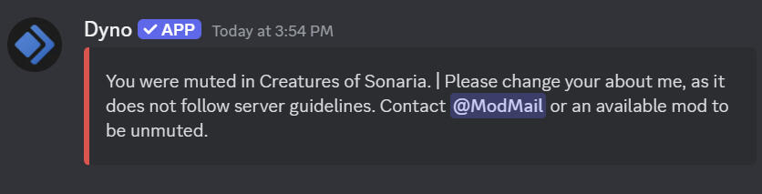 We’d like to preface this by saying that this was in no way written with the intention of canceling or bringing down Sonar Studios. This document, when it was originally written, was meant to clear the names of several users who were unjustly server and game banned. This situation was eventually resolved when a higher up was notified about it, and since then, the users have been completely cleared of their bans. However, in the process of gathering evidence alongside other volunteers and members, we had some in-depth conversations about the moderation system. We found that the way moderation is handled, and the environment that volunteers work in, needs to be changed.We highly encourage that you read the entire document before forming an opinion or taking a stance. Whatever you see here, put some thought into what it shows and what else it could imply. These accounts and stories are only one of many. It’s upsetting that it’s taken such a horribly handled situation for any of this to be brought to light, but it’s better now than never.To the active volunteers who are reading this, we sincerely hope that Sonar takes action to improve its working environment. You’ve done so much for this game and its community, and for that you have everyone’s support and thanks.To whoever from HR that may be reading this, we could have never brought these issues up to you in private. Time and time again, it’s been proven that you do not care about your volunteers, or at least the ones who you don’t play favorites with. A few members of HR themselves were the ones responsible for the unjustified bans, and have been for countless more.And finally, a quick DISCLAIMER! References to the Recognized Creator document are occasionally made throughout this document; please know that nobody who worked on that document is associated with the creation of this one. The last thing we want is for Sonar to punish or begin targeting the Contributors, especially after how hard they fought for better treatment and compensation for all of their hard work.Our end goal with this document is similar, if not the same; to point out the flaws within the moderation and tester systems, and to inspire change. Most of these problems lie in the hands of HR, and this goes especially for the way they treat their testers and moderators. We want Sonar to listen to the people who’ve poured so much time into their game and community.EDIT: Users in the Creatures of Sonaria Server are being muted for having this link in their bio, as shown below here: